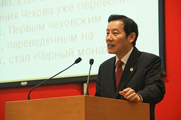 活动伊始,米哈伊尔·维克多洛维奇·梅德韦杰夫发表讲话。他首先向在座的同学们介绍了契柯夫的生平和著作。随后,他肯定了俄语学子在征文比赛中的表现。他最后希望俄语学子们能继续努力学习,为中俄两国间的交流合作做出贡献。