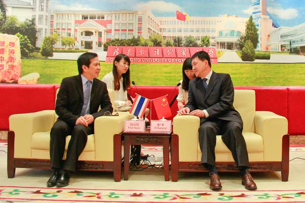 隋广军热烈欢迎伟文·丘氏君一行的到来。他用“兄弟般的友谊”形容泰王国驻广州总领事馆与我校之间的深厚友谊,并感谢泰领馆对我校一直以来的帮助和关怀。在向来宾介绍我校建校及发展情况时,隋广军提到,我校早在1970年便成立泰语系,培养了许多泰语人才,对中泰交流与合作起了积极作用。另外,隋广军提到,我校成立了“两院”(广东国际战略研究院、国际服务外包研究院),作为政府的 “智库”,服务一方并承担了一系列国家级任务。