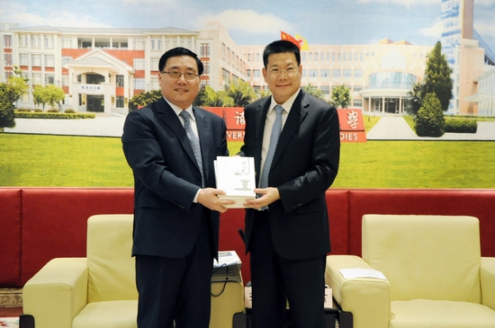 本网讯 5月8日下午,外交部赠书仪式在北校区行政楼贵宾厅举行,李华新大使代表外交部向我校赠送了一批白皮书,校长仲伟合代表我校接受赠书。李华新还为广外师生作了一场题为《国际国内形势与外交政策》专题报告。