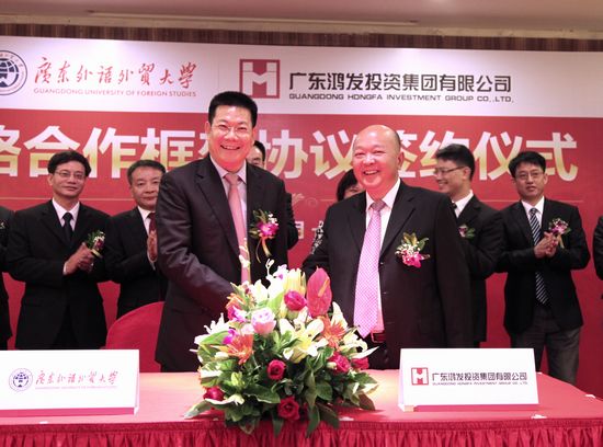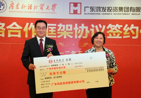本网讯 5月10日下午,广东鸿发投资集团有限公司与我校在东莞国际会展中心签订战略合作框架协议。鸿发集团总裁麦照容和我校校长仲伟合代表双方在协议书上签字。在签约仪式上,鸿发集团向我校教育发展基金会捐赠人民币500万元,用于支持我校教育事业的发展。