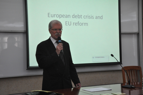 本网讯 2012年5月9日是第62个“欧洲日”,也是中欧建交37周年的纪念日。在这一天,欧盟前对外事务首席顾问、前驻中国与蒙古大使、前驻埃及和阿拉伯联盟大使安高胜博士(Dr. Klause Ebermann)受聘欧洲研究中心首位学术顾问,并在“欧洲论坛”主讲题为“欧债危机与欧盟治理改革”的讲座。活动在北校六教B103室举行。校党委副书记、欧洲研究中心学术委员会主席陈建平,广东国际战略研究院秘书长李青、国际合作交流处副处长梁洁、欧洲研究中心主任蔡红以及欧洲学硕导、欧盟让莫内课程项目主持人王小海以及全体欧洲学硕士研究生与部分法律硕士研究生见证了受聘仪式。