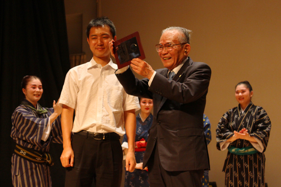 本次演出由日本国驻广州领事馆主办,广东省文化厅、NPO法人冲绳文化民间交流协会、广东外语外贸大学协办。日本驻广州首席领事田尻和宏与我校国际合作与交流处副处长吴俊峰一同出席了本次演出。吴俊峰向舞蹈团团长玉城正保赠送了纪念品。