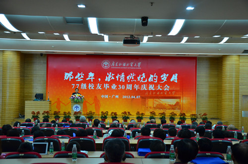 本网讯 2012年4月7日上午,广外77级校友毕业30周年聚会在北校区图书馆多功能报告厅隆重举行。周末寂静的广外校园内热情漫溢,近150名校友从世界各地汇聚母校,共叙同窗师生旧情。我校校长仲伟合,校党委副书记许国彬,77级教师代表,相关学院、部门负责人以及校友总会秘书处全体工作人员参加了本次庆祝活动。