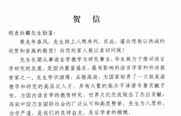 本网讯 为庆贺我国著名语言学家、北京大学资深教授胡壮麟先生八十诞辰,北京大学于2012年3月31日举办“胡壮麟教授八十华诞学术研讨会”。此次研讨会旨在庆贺胡壮麟教授在中国语言学学科发展、中国功能语言学研究、符号学研究、文体学研究以及外语教育研究等领域的卓越成就和巨大贡献,研讨中国语言学的学科建设、理论视角、发展趋势及应用前景。来自北京地区和全国各地高校的专家学者一百多人出席研讨会,我校党委副书记陈建平教授应邀出席。在研讨会开幕式上,北京大学校长周其凤教授致词向胡壮麟教授表示祝贺并亲自题字为胡教授贺寿。陈建平代表我校向胡壮麟教授表示祝贺并代表校长仲伟合教授转送贺信和贺礼。我校桂诗春、钱冠连等教授也分别在学术期刊上撰文介绍胡壮麟教授的学术贡献。
