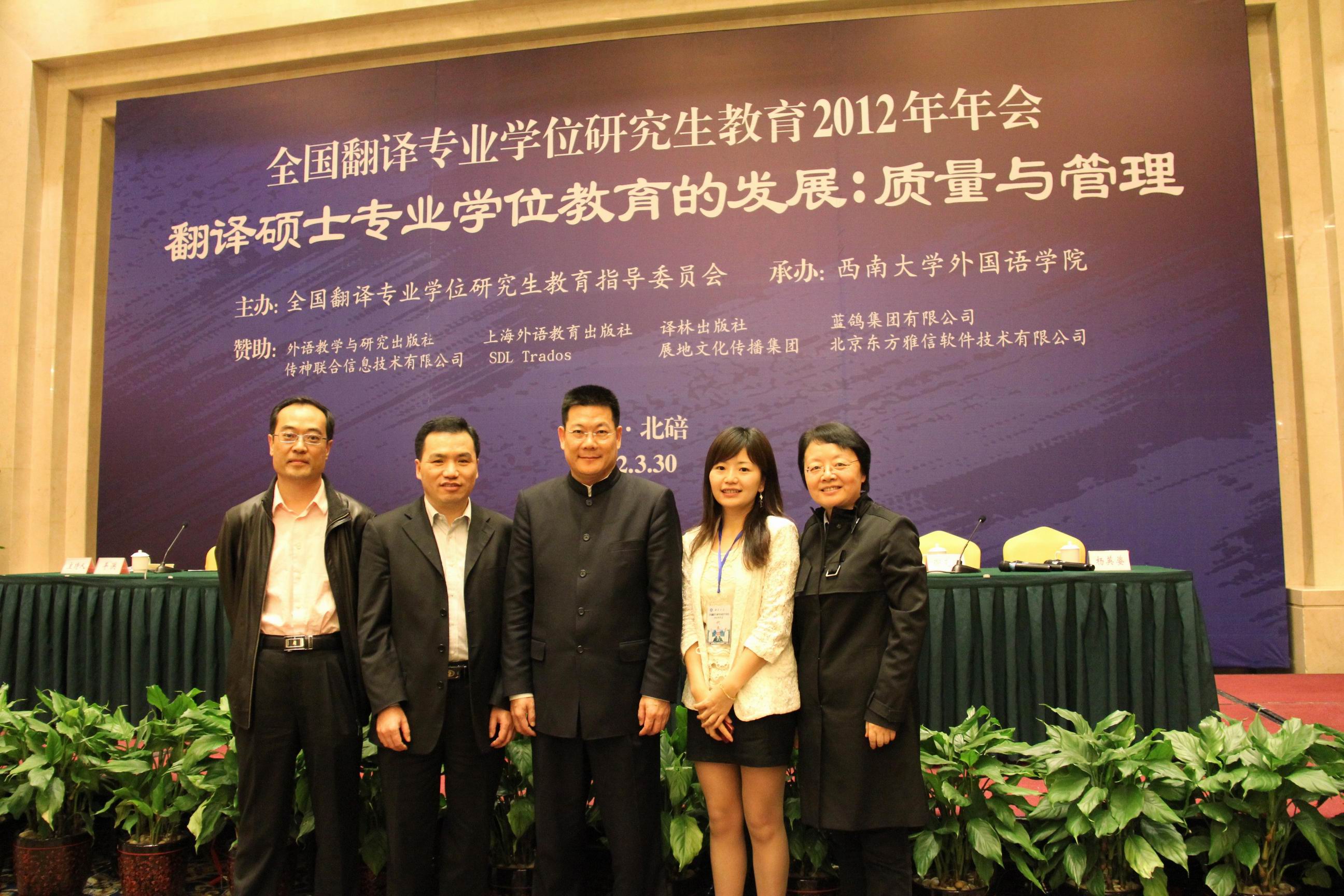 本网讯 3月29至30日,全国翻译专业学位研究生教育2012年年会在重庆召开。国务院学位办陆敏处长,全国翻译专业学位研究生教育指导委员会主任委员、国家外文局副局长黄友义,副主任委员、我校校长仲伟合,北外教授何其莘,教指委秘书长、我校翻译学院院长平洪和其他教指委委员以及全国159所MTI培养单位共200多名代表出席了会议。我校翻译学院副院长赵军峰、教授穆雷以及翻译学博士生邓轶也参加了本次会议。