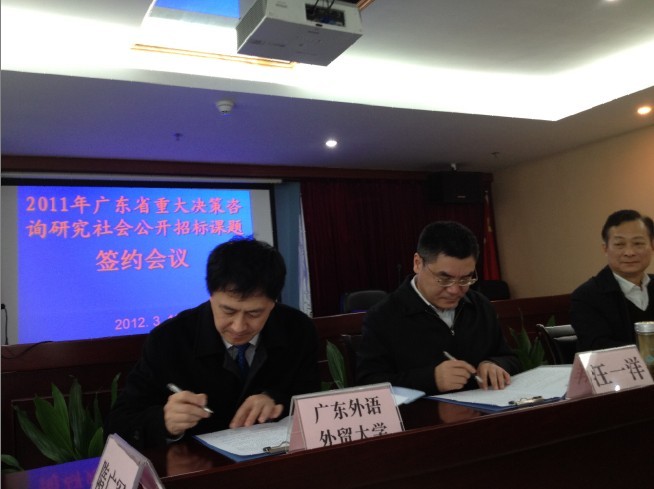 本网讯 3月12日下午,“广东省重大决策咨询研究公开招标课题协议书”签约会议在广东省人民政府发展研究中心举办。我校“广东建设亚太服务外包中心研究”课题中标,课题负责人隋广军教授、课题组主要成员孙晓琴教授参加了会议。隋广军与广东省人民政府发展研究中心主任汪一洋代表双方在协议上签字。