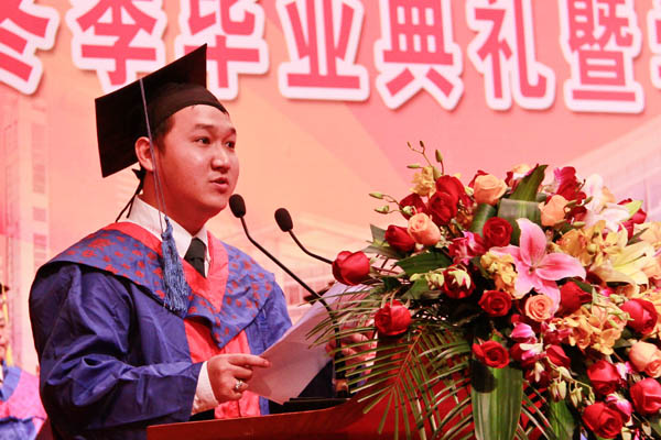 来自印尼的留学生王荣强作为学生代表,用四个“忘不了”叙述了他对母校、对老师、对同学的深情,叙述了他在母校的学习生活。他感谢上帝,感谢国家汉办、孔子学院,感谢母校,感谢老师,感谢父母,感谢朝夕相处的同学,感谢他们的帮助支持,感谢他们让自己度过了一段的美好的校园生活。