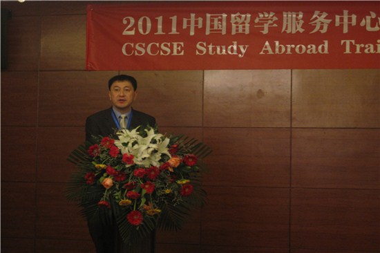 中国留学服务中心主任白章德致开幕词,他希望中心能与纽卡斯尔等外国大学和国内的十所出国留学培训基地院校等合作单位加强沟通,共同引进更多优质项目,并表示中心将提升服务水平,打造精品,规范管理,推进学生、学术交流合作。