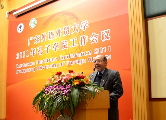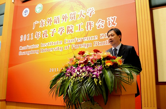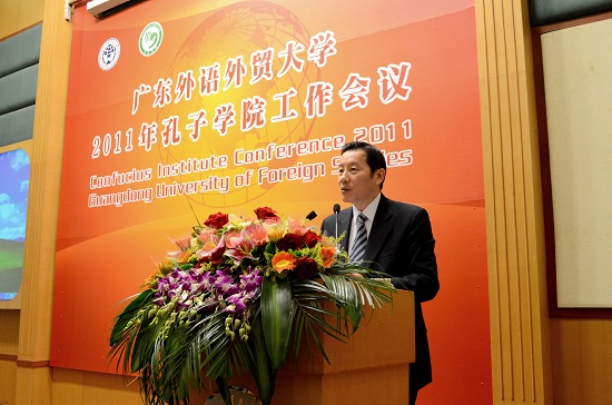 随后,我校2011年孔子学院工作会议在行政楼国际会议厅召开,会上安排了俄语及西班牙语翻译员进行同声传译。隋广军在致辞中说道:“孔子学院以汉语教学为载体,为宣传中华传统文化、加强中外交流与合作、增进理解和友谊、促进世界和平与共同发展搭建了很好的平台。广外作为国际化特色鲜明的教学研究型大学,作为华南地区国际化人才培养和外国语言文化、对外经济贸易、国际战略研究的重要基地,有责任、有义务为孔子学院工作做出贡献。”