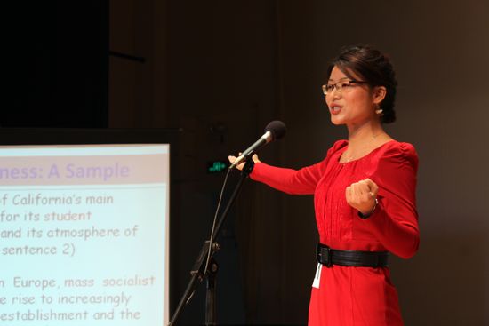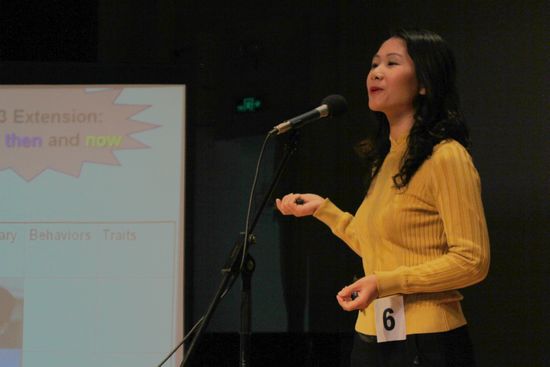 全场唯一的男老师刘亮星也在市场营销英语授课方面表达了自己的见解。他以“less is more”为主题为现场的观众拉开了英语专业课的新画面。接着他强调“professional contest”为主线,并将枯燥难懂的BCG知识化为形象可爱的图片予以展示。尽管演说简短,但是让在座的观众中顿觉耳目一新,从他的专业方法中感受到了英语教育的新力量。