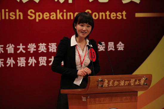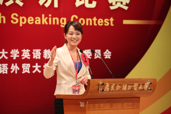 本网讯 11月20日下午,“外研社杯”全国英语演讲大赛暨广东省大学生演讲比赛在广外北校六教报告厅举行,我校选手高级翻译学院刘慧夺得广东赛区冠军,亚军和季军则分别由中山大学的陈彦君和暨南大学的周琳获得。同时这也意味着他们获得了12月份全国总决赛的入场券。我校商英学院沈家慧和翻译学院王怡分别获一等奖和二等奖。