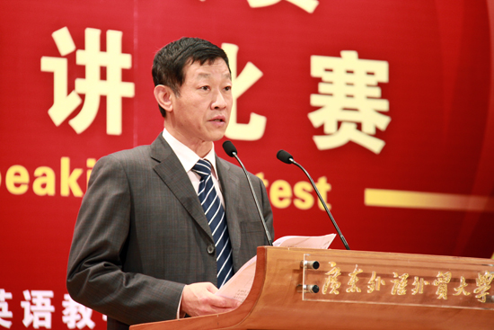 我校党委副书记许国彬出席比赛现场并致辞,许国彬在致辞中指出,近年来,广外一直努力探索国际化人才培养的新模式,致力于培养具有国际化视野、通晓国际规则、能直接参与国际合作与竞争的有社会责任感的国际化人才,并且积极参与和承办各种专业学习交流的竞赛。他说,“外研社杯”全国英语演讲比赛广东赛区决赛暨广东大学生英语演讲大赛,会成为推动我省国际化人才培养的重要舞台,会成为有志于做顶尖国际化人才大学生的成长平台,会成为爱专业、爱钻研的师生的交流平台。
