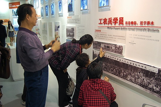 而在13日上午,校友们来到南校,在校友总会秘书长谢伟光的陪同下参观南校图书馆六楼的校史馆。校友们边听着解说员介绍我校的发展历程,边观赏着橱窗里陈列着的30多年前的老照片。在“名师榜”前面,这群花甲老人找寻着那些熟悉的面孔,回忆着恩师的点滴。“当年老师们对我们关怀备至,有时还上宿舍询问我们的学习生活情况,我们都很感激他们。”徐桂云女士说。35年光阴,也让很多人感叹时过境迁。在李慰慈教授的照片前,一位校友黯然感慨道:“她也走了!”照片下是李教授的生卒年月:1907-2001。在一张摄于1976年的首届工农兵学员毕业合影前,一位72级的校友找到了照片里的自己,她学着里面的动作把手掌交叠,掌心向外,笑着说到:“这是我的招牌动作。”
