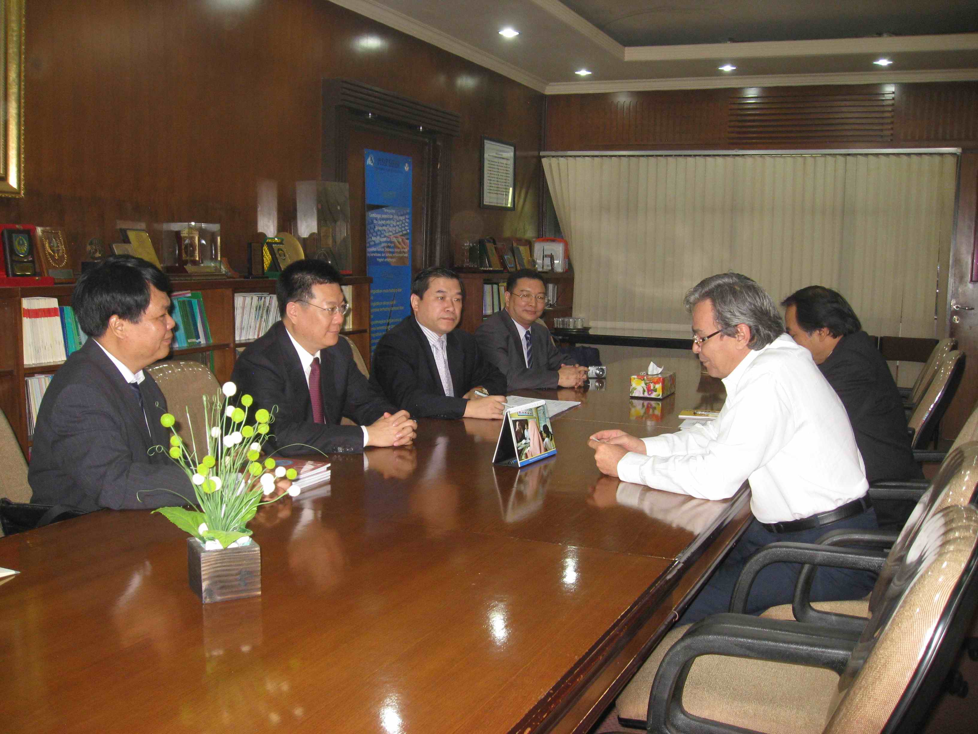 11月9日上午,仲伟合会见了印尼教育部语言文字司司长阿古斯·达尔玛先生、前语言文字司司长丹迪·苏葛诺先生、语言文字司语言发展处处长苏基约诺先生。双方希望今后进一步在政治、经济、语言、文化等广泛的领域展开研究的合作,并商谈了互派学者讲学授课、共同培养研究生等项目。