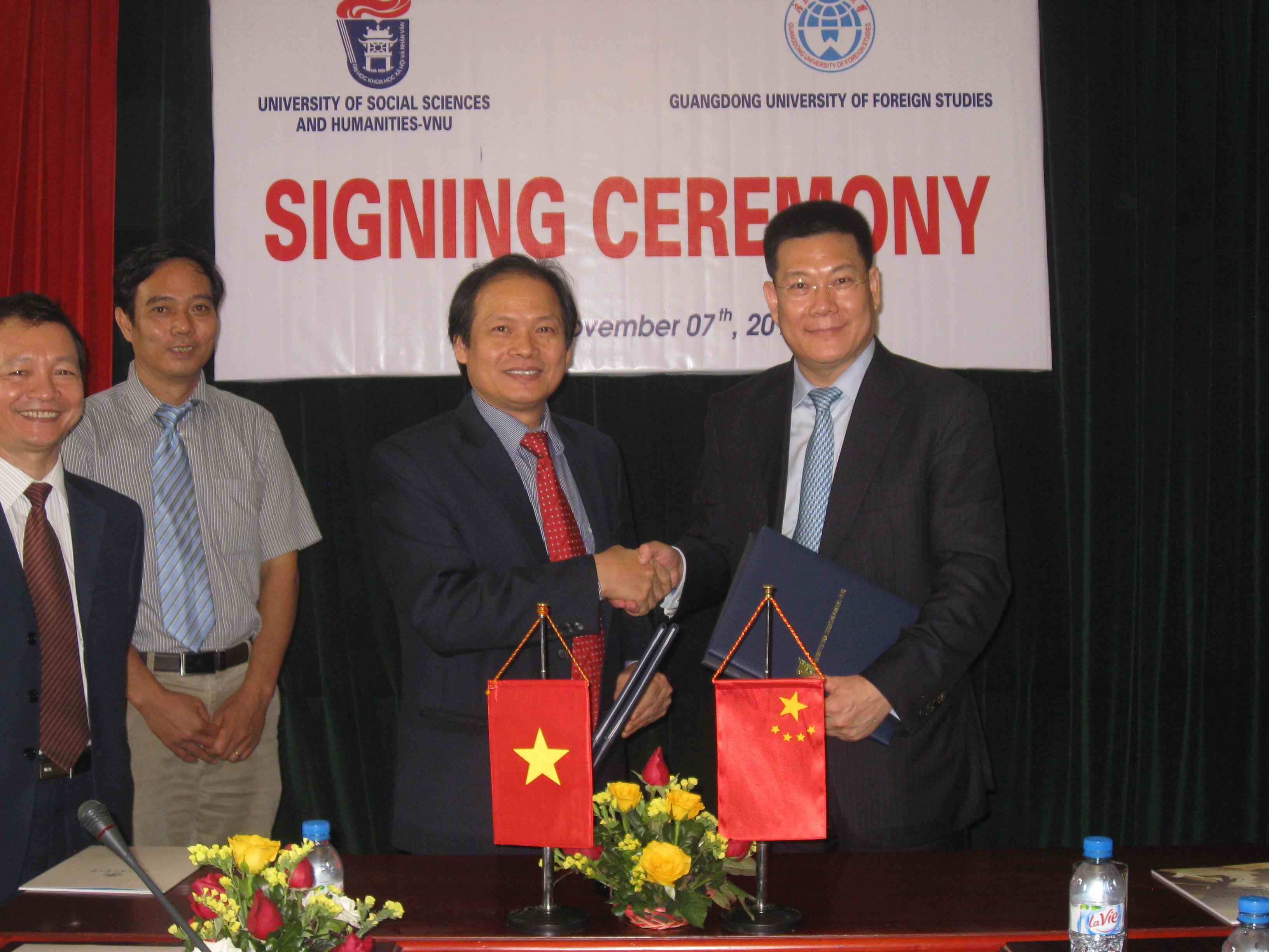 11月7日上午,仲伟合会见了越南河内人文社科大学校长阮文庆。两校领导肯定了双方多年来在共同举办泛亚语言学会议、学生交换、学者互访等领域取得的成果,并希望今后扩大和深化彼此的合作,尤其是在扩大学生派出规模及加强合作研究服务区域发展等方面。会后,仲伟合与阮文庆续签了两校在多领域深化合作的协议书。仲伟合还特意与在该校学习的我校学生见了面,鼓励他们珍惜难得的国外学习机会,努力学习,学有所成。梁学宏也在该校中文系推介了我校的留学生招生政策。