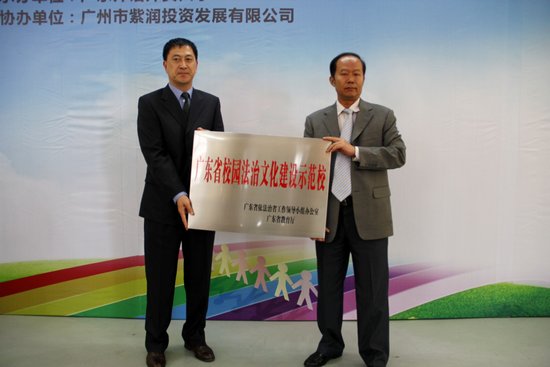 随后,黄慧彪代表省依法治省办向我校进行“广东省校园法治文化建设示范校”的授牌。