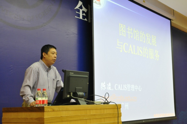 陈凌以图书馆和CALIS服务的发展为题做了主题报告。他回顾了图书馆发展的历史、特别是在web 2.0和云计算冲击下,大学图书馆的发展历史和趋势,并用自己的经验诠释了CALIS的理念。“在我以前就读北大的时候,拿着借书条到图书馆借书也是战战兢兢的,像现在这样开架借阅对我而言简直不可想象,何况还有数字图书馆,可以随时随地使用。”他特别提到著名图书馆学家阮冈纳赞的图书馆学五定律,认为“图书馆是一个生长着的有机体”,必须不断适应环境和读者的变化,拓展自身功能,提供更加人性化的服务。随后,他就CALIS的服务理念和服务政策展开详细的阐述,并表达了对外语联盟图书馆平台的期望,希望这一个平台可以将外语院校联盟的师生的生活、学习、工作融为一体。陈凌还现场演示了11月10日在北京刚刚开通的“e得”资源获取门户,并就CALIS与外语院校图书馆联盟的合作作了展望。