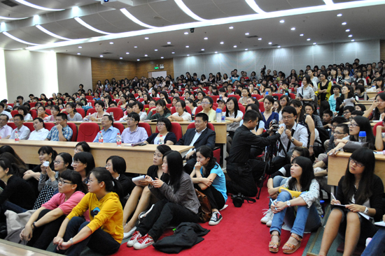 本次著名教授论坛由人事处主办,翻译学院承办,整个多功能报告厅被挤得水泄不通。论坛开始之前,校长仲伟合教授代表学校、也代表我校全体师生和所有许教授的粉丝们向许渊冲教授赠送了纪念品。