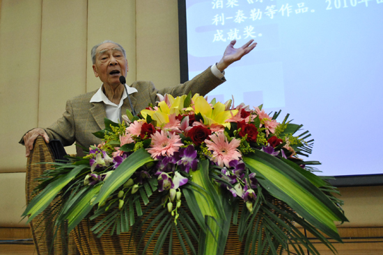 本网讯 11月3日下午,被誉为“书销中外六十本,诗译英法惟一人”的北京大学教授、著名翻译家许渊冲来到了我校北校区图书馆负一层学术报告厅,这位钱钟书的学生、杨振宁的同学畅谈了中国学派的文学翻译理论,同慕名前来的听众分享了他70多年的翻译历程。他那幽默的谈吐加上中气十足的“大嗓门”博得了现场观众连连不断的掌声。