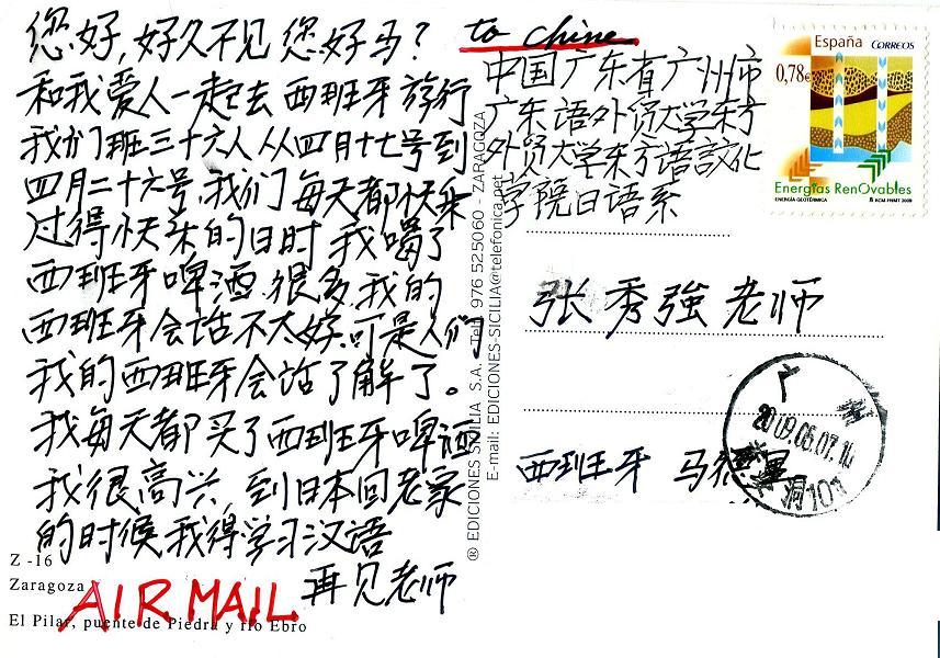 孔子学院学员从西班牙给张秀强寄回来的明信片
