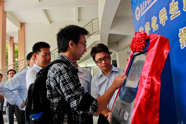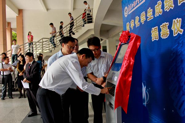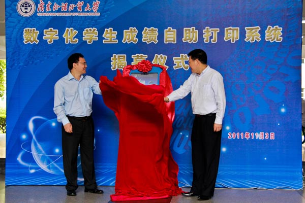 本网讯 11月3日上午,我校首台学生成绩自助打印系统TPM (Transcript Printing Machine) 揭幕仪式在北校区第二教学楼大厅举行,这标志着由我校教务处负责筹划落实,创时科技公司提供技术支持的学生成绩自助打印系统TPM在经过10个多月的研发和一个月的试运行后,正式投入使用。我校校长仲伟合、副校长刘建达、教务处处长詹文都以及各部门、学院相关领导人出席了揭幕仪式。