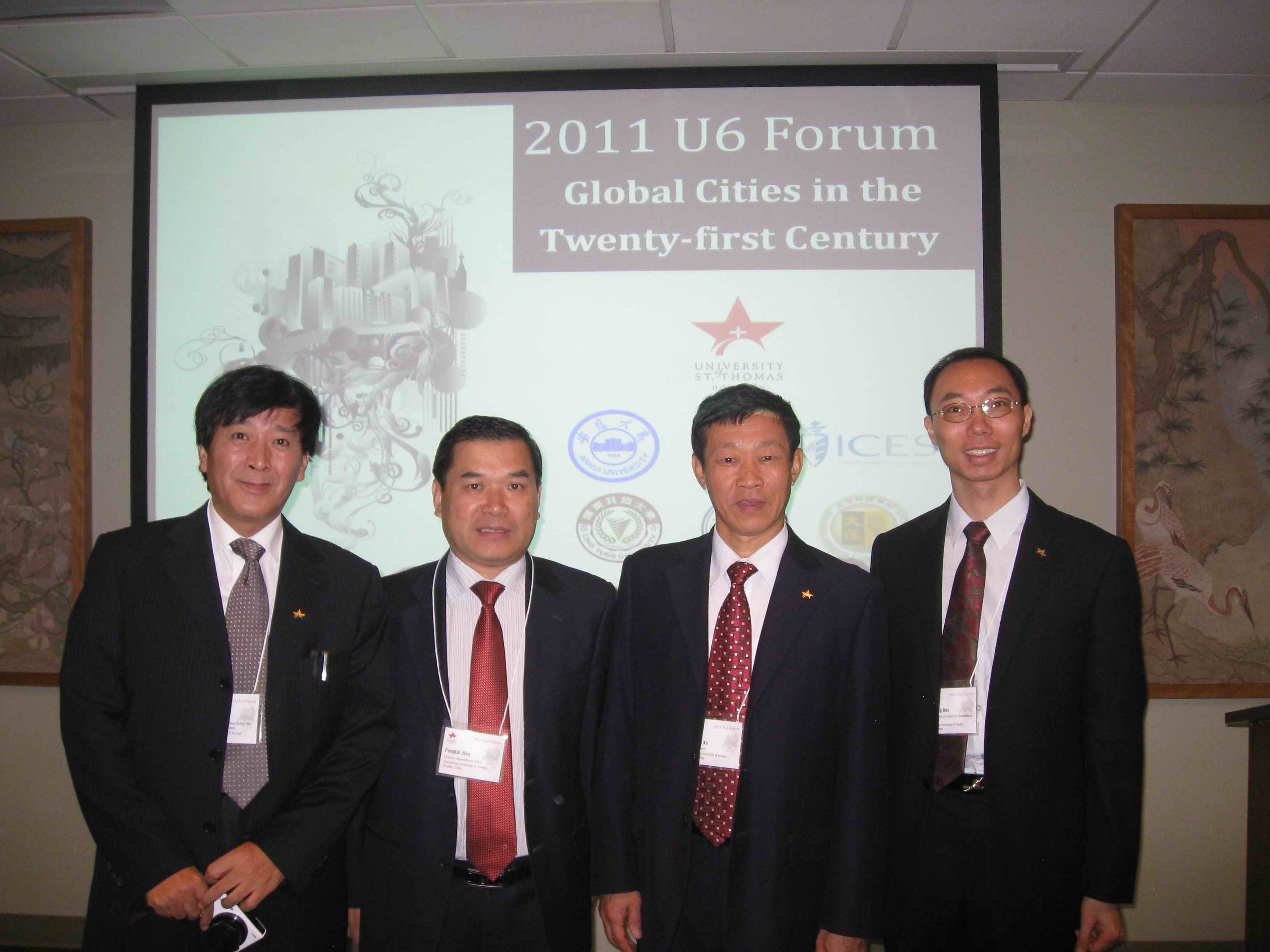 10月中旬,“2011六校论坛”在休斯顿圣托马斯大学举行。来自安徽大学、广东外语外贸大学、智利圣托马斯大学、台湾岭东科技大学、台湾文藻外语学院等高校的领导和学者共30多人参加了会议。在论坛开幕式上,美国休斯顿圣托马斯大学校长罗伯特·伊万尼(Robert Ivany)代表学校对参加论坛的各方与会者表示欢迎。本次论坛的主题是“21世纪的全球化城市”。我校郭桂杭副院长和李永宁研究员分别以“基于文化视角的全球化城市:以广州为例”及“当代中国的移民、城市化及大城市发展”为题做了发言,受到了与会者的好评。在随后召开的六方院校负责人会议上,许国彬代表学校对本次“六校论坛”取得的成果给予肯定,并希望以此为平台,更好地深化校际间的多方面的合作。会议决定,“2012六校论坛”将于明年10月在智利圣地亚哥举行。