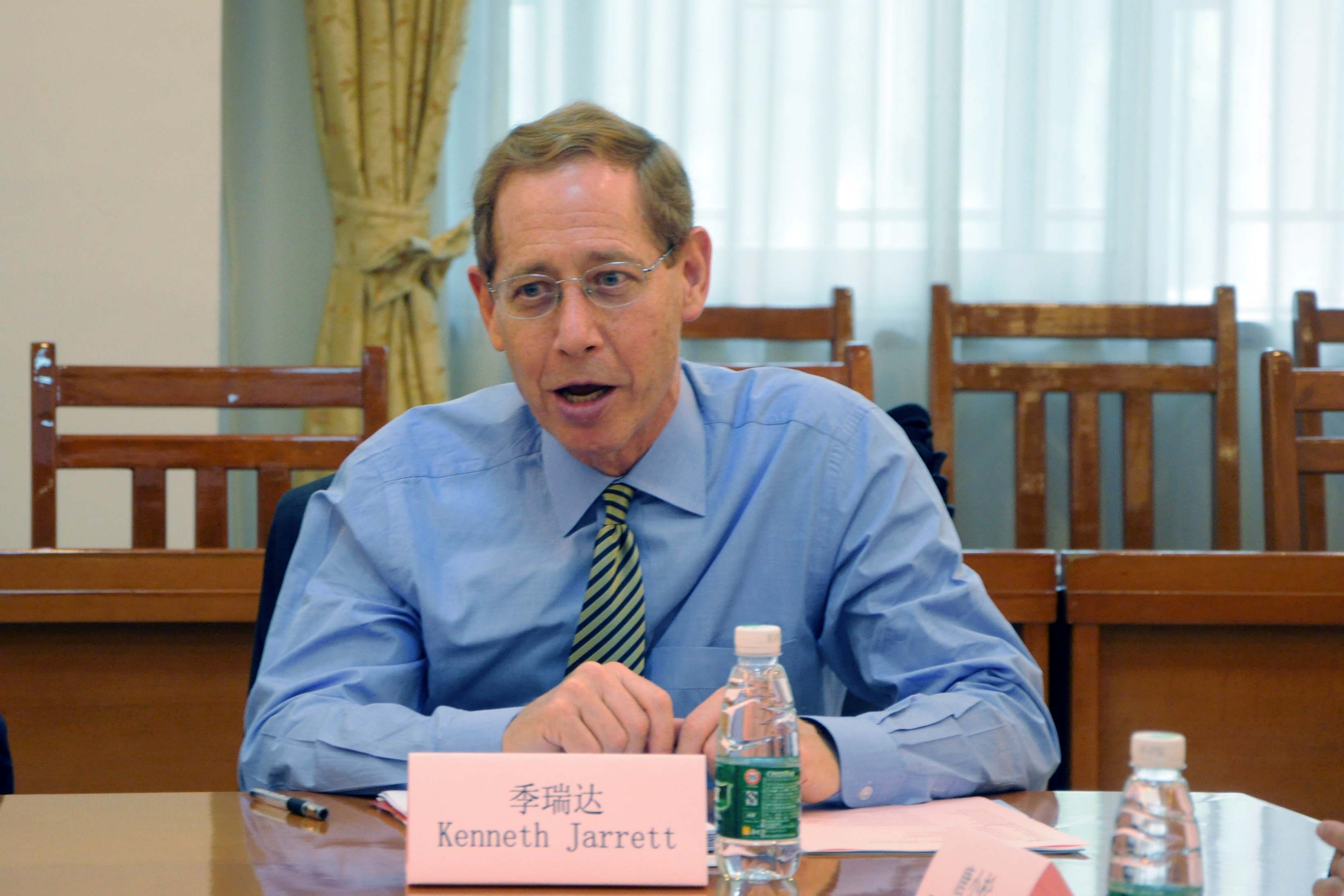 石佑启首先对季瑞达(Kenneth Jarrett)的来访表示热烈的欢迎,并向他转达了校党委书记隋广军的问候。石佑启在向季瑞达(Kenneth Jarrett)介绍了我校的历史文化、办学特色以及教育理念的同时,着重强调了国际战略研究院的重要地位。他表示,国际战略研究院立足广东、辐射全国、面向世界,对广东的社会发展起到了重要作用。
