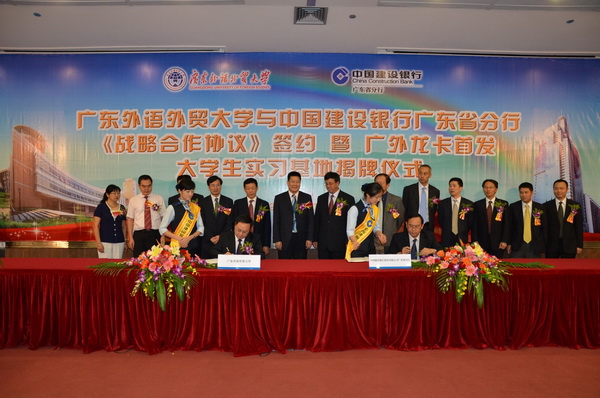 本网讯 10月10日下午,广外与中国建设银行广东省分行《战略合作协议》签约暨广外名校卡首发、大学生实习基地揭牌仪式在建行广东省分行会议室隆重举行。此次我校与建行广东省分行开展战略合作,是我校首次与银行界开展战略合作,意义重大。