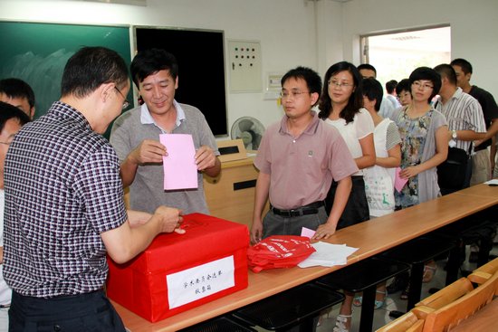 当天15个学院在南、北校区分别召开了选举大会,由各学院院长主持。院长清点到会人数,在确定到达人数超过应到人数三分之二以上后,由学校特派员介绍说明选举流程和具体事项。接着,大会当场推选三位工作人员(无投票权)作为监票员、计票员和唱票员,并由院长简要介绍候选人的学历科研情况后,工作人员派发选票,投票人经过认真考虑后,进行无记名投票。 投票结束后,由工作人员当面点清收回的选票并当面计票。按规定,候选人获得的赞成票超过实际到会人数一半就可直接当选。选举结果出来后,由院长向当选委员当场颁发聘书,并相继召开学院学术委员会第一次会议,由当选委员选举本学院学术委员主席及副主席各一名。