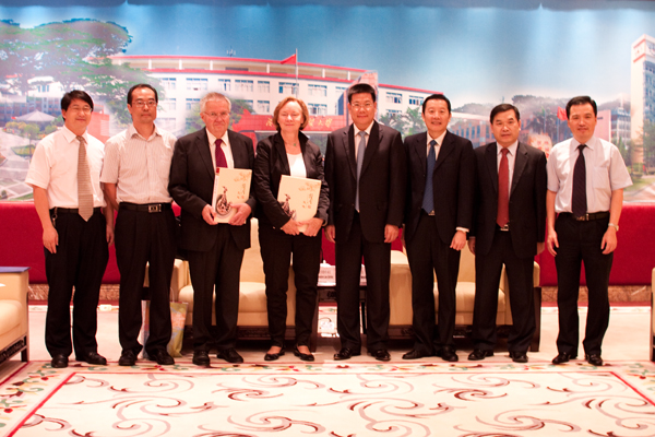 本网讯 9月13日下午,国际大学翻译学院联合会主席Hannelore Lee-Jahnke和秘书长Martin Forstner来访我校。校长仲伟合、副校长方凡泉等在北校行政楼贵宾厅热情接待了来宾。