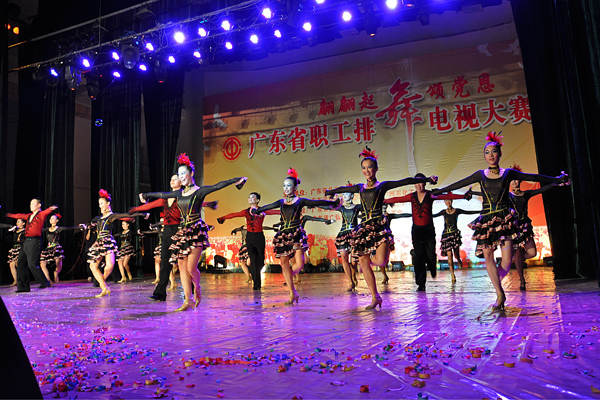 本网讯 9月15日晚,由广东省总工会与广东省体育局共同主办,以“翩翩起舞颂党恩”为主题的广东省职工排舞电视大赛在广石化影剧院隆重举行。来自全省各企业事业单位的21支代表队参加了本次比赛。经过激烈的角逐,由广东省教科文卫工会推荐、来自我校选派的二十四名教职工组成的“SUNSHINE”排舞队;在编导及教练师小蕴、孔淑敏等老师的指导下,经过近三个月的紧张排练和悉心准备,以标准的舞码、独特的编排、青春靓丽的风采赢得了评委和观众的好评,最终获得银奖的好成绩。