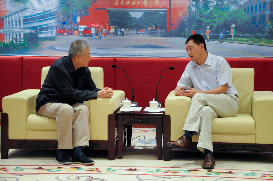 隋广军对我校的发展历史和教学特色向贵宾进行了简要的介绍。他讲道,广外凭借自己的外语特色一直保持着较高的就业率,学生就业竞争力更是位居全国大学前列。他诚意邀请孙家栋来年春天时再来学校参观,欣赏校园盛开的樱花和梨花,并为学生们进行爱国主义和科学技术教育。孙家栋一行也代表广大家长感谢广外对人才培养作出的贡献。