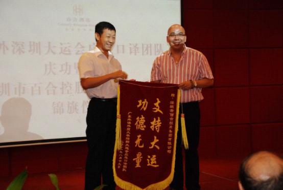 本网讯 8月21日晚,广外深圳大运会应急口译队庆功暨赠送深圳市百合控股集团有限公司锦旗仪式在深圳百合酒店17楼宴会厅举行,我校党委副书记许国彬代表广外深圳大运会应急口译队向深圳市百合控股集团有限公司赠送锦旗。