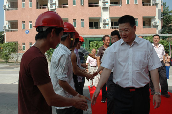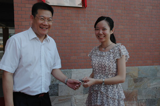仲伟合一行来到新建的云峰公寓学生宿舍,与将入住的研究生代表一同为云峰公寓揭幕并交付钥匙,随后参观了宿舍。云峰公寓统一是上床下桌,一个宿舍住4个人,带独立卫浴以及空调。新宿舍由于地理位置好,可观望的风景极佳,向外远眺即是白云山。有领导甚至打趣道:“在走廊这摆一桌,中秋绝佳赏月地啊!”而正在新宿舍里忙着打扫卫生的英文学院的杨同学则说道,“云峰很漂亮很大,能搬进新家我很兴奋。但是宿舍里面的硬件设施如阳台晾衣杆、洗漱台上的架子、电话机等等都还没有完备,希望学校领导能够加大力度尽快解决好这些问题。”据了解,由于研究生宿舍一直十分紧张,因此这次新建的云峰公寓大部分将会给研究生入住,另外有一部分会给现住在9栋的英文学院女生和新生入住。