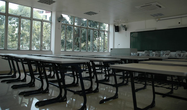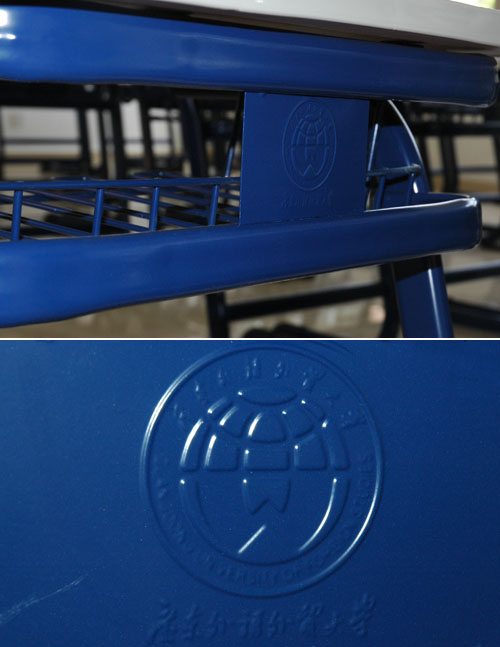 桌子的正面印有广东外语外贸大学的标志,底色为广外蓝,课室桌椅也真正实现了“广外化”。