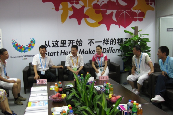 本网讯 8月12日上午,在大运会正式开幕的前夕,仲伟合、许国彬一行首先来到深圳市外办大运会临时办公点,慰问在这里工作的我校学生。仲伟合在慰问中指出,大运会的外事服务工作要求高、工作量大,希望大家鼓足干劲,高标准、高质量完成工作,充分展示广外学子的精神风貌;注意协调与配合,培养团队合作精神,学会包容与理解,抓住机会锤炼自己的各方面能力,进一步完善自己、提高自己。
