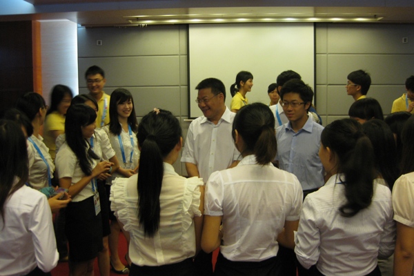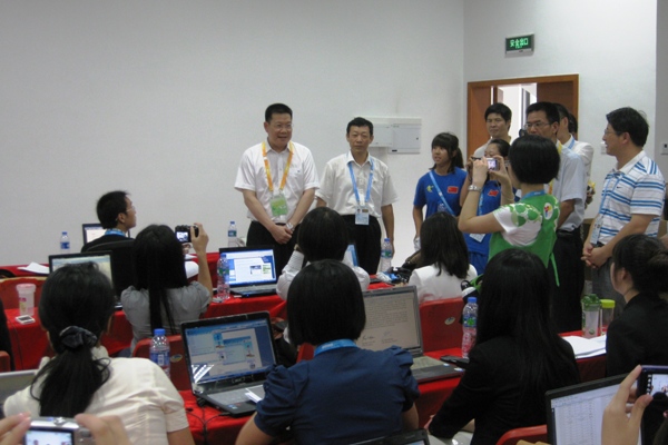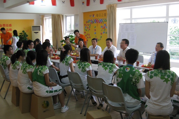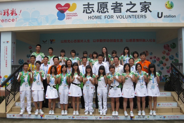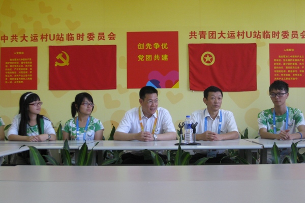 随后,仲伟合等来到大运村志愿者之家--U站,亲切慰问正在服务的我校小语种志愿者。仲伟合指出:近年来,我校学生连续参与了包括奥运会、亚运会、亚残运会、上海世博会和深圳大运会在内的许多大型涉外活动的志愿服务工作。作为一所以国际化为办学特色的学校,同学们在志愿服务工作中以专业、专注的表现征服了参加活动的国内外来宾,同时也形成了独具特色的广外志愿精神。仲伟合希望同学们能够继续秉承“坚韧、包容、进取、专业、团结、奉献”的广外志愿精神积极服务大运会,做到服务他人,锻炼自己,收获友谊。仲伟合特别嘱咐同学们,天气炎热,大家工作量大,一定要照顾好自己,注意休息。