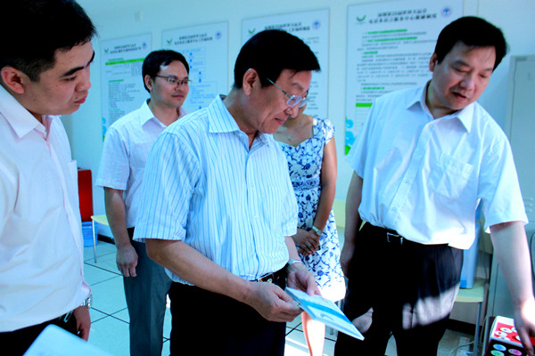 北外领导了解多语中心手册及徽章 随后,杨学义一行与志愿者进行了亲切交谈。他们询问了西语志愿者的口译服务情况。当得知西语口译员接听的电话比较多,一般是拉美国家外宾寻求在医疗、交通、大运村服务等方面的翻译时,他们说,志愿者24小时轮班工作,工作时间长且辛苦,希望同学们能够坚持下去,出色地完成大运会电话口译服务的工作。