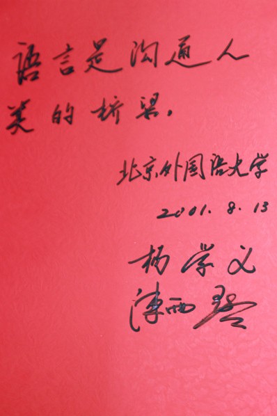 北外领导与志愿者合影留念 杨学义、陈雨露为多语服务中心题词并留名:“语言是沟通人类的桥梁”,肯定了多语服务中心在国际外宾与深圳大运会语言沟通方面所起到的作用。