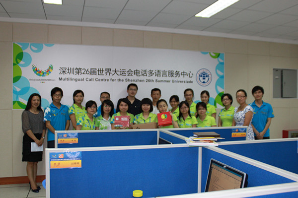 本网讯 8月13日下午,深圳大运会外联部语言服务中心经理张海林在我校党委副书记许国彬等陪同下,亲切关怀多语言服务中心志愿者的工作,并赠送了大运会纪念慰问品。
