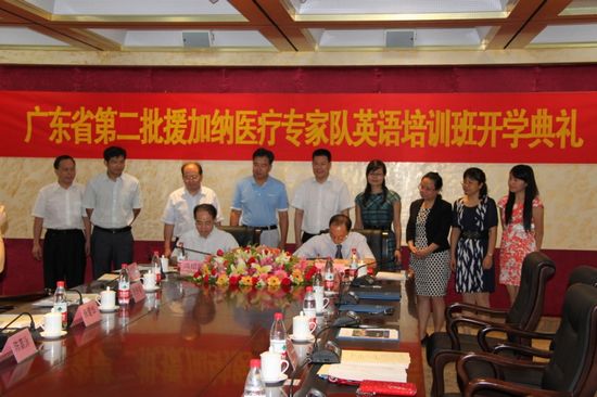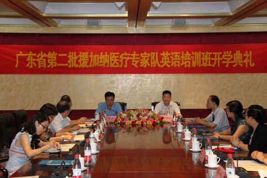 本网讯 7月18日,由我校与广东省卫生厅共同举办的“广东省卫生厅第二批援加纳医疗专家队英语培训班”开学典礼在北校区第一会议室隆重举行。省卫生厅副厅长廖新波、我校校长仲伟合、卫生厅交流合作处处长冯绍民、卫生厅援外中心副主任张爱华、商英学院党委书记车小真、商英学院主持工作副院长郭桂杭及其他相关领导和老师、培训班全体学员参加此次开学典礼。会议由商英学院副院长吴易明主持。