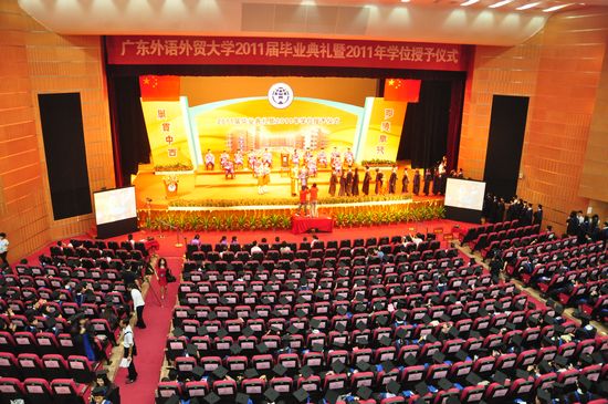 本网讯 “一段广外路,一生广外情。”又是一年凤凰花开时,广外再一次迎来了送走毕业生的时刻。6月25号上午9时,我校2011届毕业典礼暨学位授予仪式第一场经贸学院专场在南校区大会堂拉开了帷幕。校长仲伟合,党委副书记许国彬,副校长方凡泉、石佑启,经贸学院领导老师,2011届经贸学院全体毕业生及部分学生家长代表出席了此次典礼。本场毕业典礼由许国彬主持。