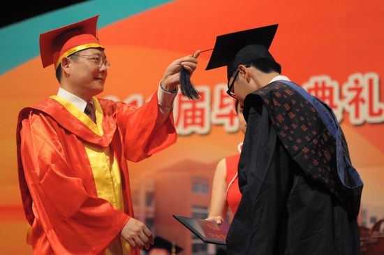 在将近两个小时的时间里,伴随着时而激昂时而轻快灵动的音乐,仲伟合一一为毕业生颁发学位证书,并亲自为每一位拨穗,象征着毕业生已学有所成,能够扬帆远航。当最后一位毕业生从仲伟合手中接过证书时,与仲伟合的拥抱使得全场掌声雷动。激动之余,仲伟合将手中的献花抛向观众席,又一次掀起毕业典礼高潮。