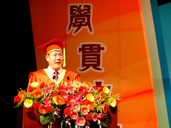 本网讯 6月27日,云山会堂迎来了我校北校区首场毕业典礼——广东外语外贸大学2011届毕业典礼暨学位授予仪式国际商务英语学院和MBA教育中心专场。校长仲伟合的演讲延续此前轻松、亲民的风格。莅临典礼的校领导还有副校长方凡泉、顾也力、石佑启。