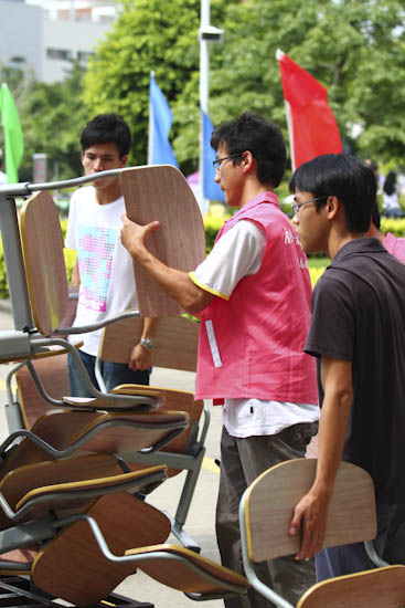 在烈日下搬运椅子