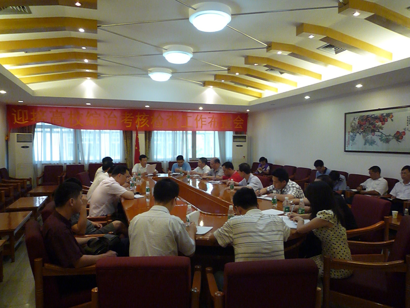钟罗军就我校迎接高校治安综合治理考核检查工作有关事项作了详细的汇报。他指出,考核检查工作每三年开展一次,是对我校三年来综合治理工作的一次评估。我校有关单位要高度重视,结合维稳工作,不放过任何安全隐患。他表示按照相关文件要求,考核检查方式主要以检查和汇报为主,具体分为听取工作汇报、查看校容校貌、核实档案资料和综合评价反馈。