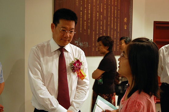 仪式过后,各位领导和嘉宾及企业代表参观了新体汇,广东百汇管理咨询有限公司的CEO招东良先生为各位来宾进行了介绍。各位来宾饶有兴致,黄浩更是即兴挥毫,手书“创新”两个大字,赢得在场一片掌声。随后,蔡高声一行在仲伟合等校领导的陪同下参观了我校的校史馆和程贤章收藏陈列馆。