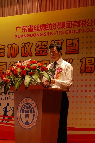 仲伟合致辞。他代表学校全体师生员工对各位领导、嘉宾的到来表示热烈欢迎,并向长期以来关心支持我校事业发展的省教育厅,以及省丝绸纺织集团有限公司等社会知名企业表示衷心感谢。他说,即将揭幕的“新体汇广外创意创业中心”暨“新体汇广外店”,是我校按照“云山模式”打造的第29个勤工助学基地。它由我校与省丝绸纺织集团旗下的广东百汇管理咨询有限公司共同建设,是国内首个以大学体育品牌化和产业化带动学生创业实践的全新的校企合作勤工助学基地。这是我校与省丝绸纺织集团战略合作结出的又一硕果。