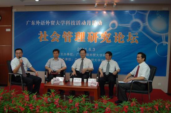 本网讯 6月3日,以“创新社会管理研究,提升服务社会能力”为主题的社会管理研究论坛在我校广晟讲堂举行,中国著名社会学家、中国人民大学前副校长、社会学博导郑杭生教授,广州市委党校常务副校长王永平教授,中山大学人类学博导周大鸣教授以及我校校长仲伟合教授、副校长顾也力教授参加了论坛。论坛由科研处主办、政治与公共管理学院协办。