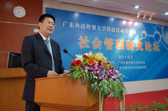 仲伟合首先致辞,他表示,社会管理事关社会的长治久安、和谐稳定。破解社会问题,需要系统、全面、深刻的研究,需要紧跟重大问题,这些都离不开多学科的研究和探讨。因此他非常欢迎专家到广外来讲学,并祝愿论坛圆满成功。